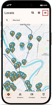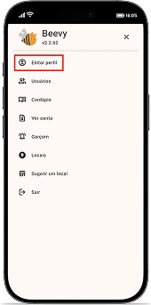 Usando seu smartphone, abra o Beevy e acesse o menu de configurações do aplicativo (destacado em vermelho na imagem)